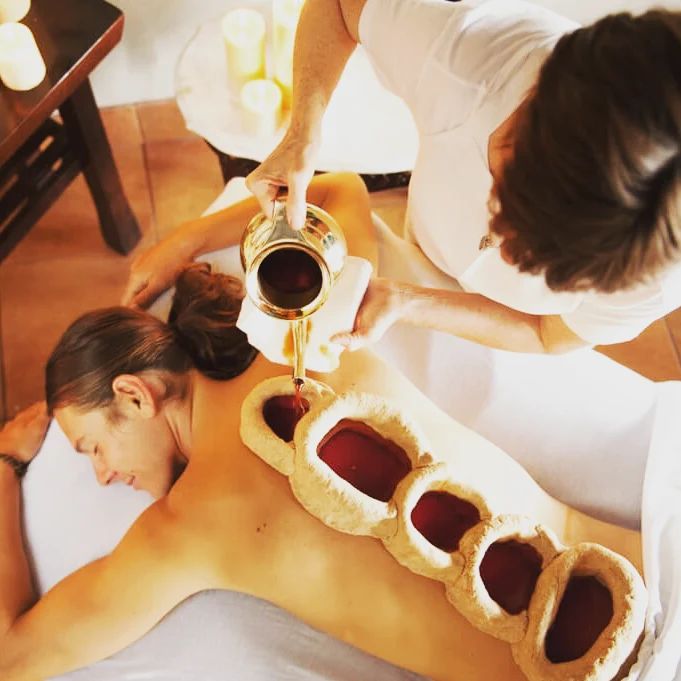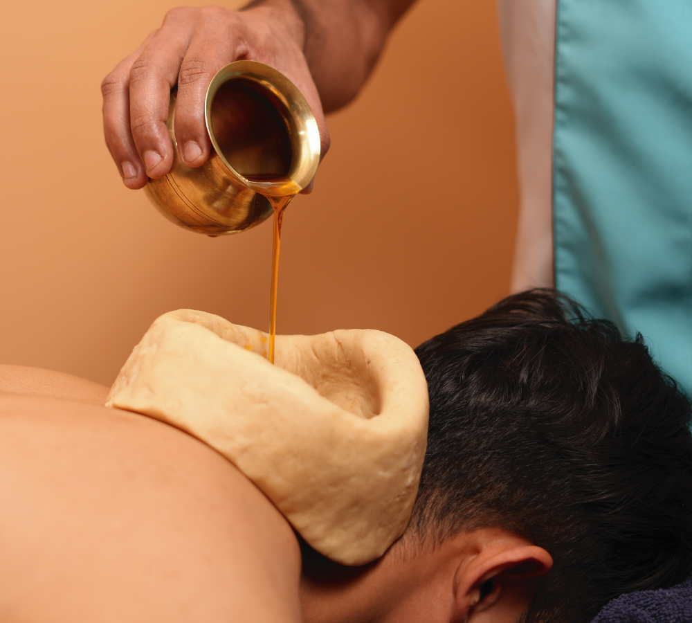 This treatment uses herbal oils massaged into the head and shoulders to release tension and stress. It focuses on the upper body, relieving headaches, neck stiffness, and mental fatigue. The therapy promotes deep relaxation and improved mental clarity.